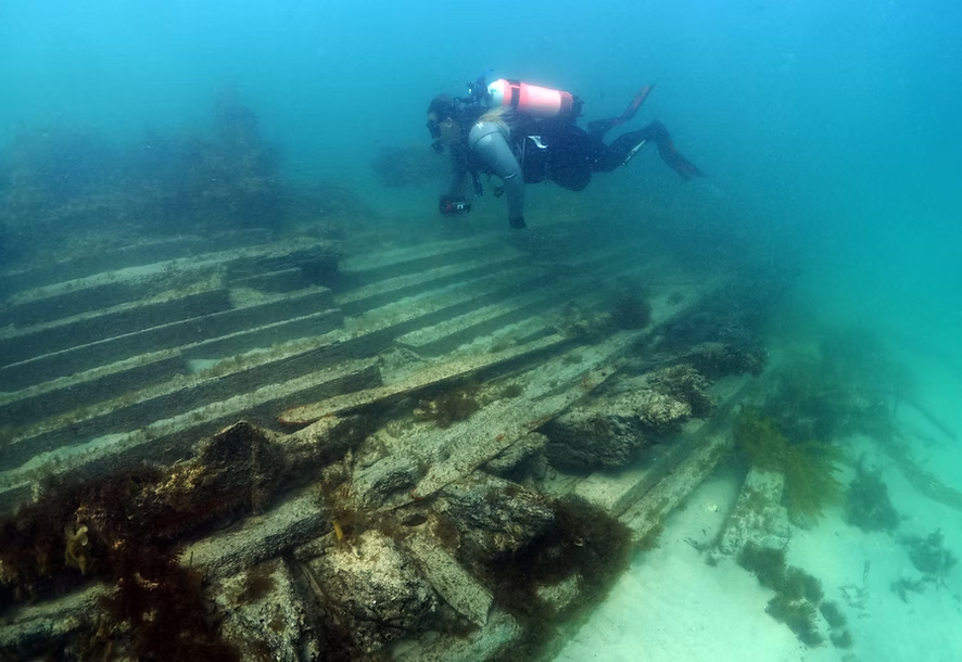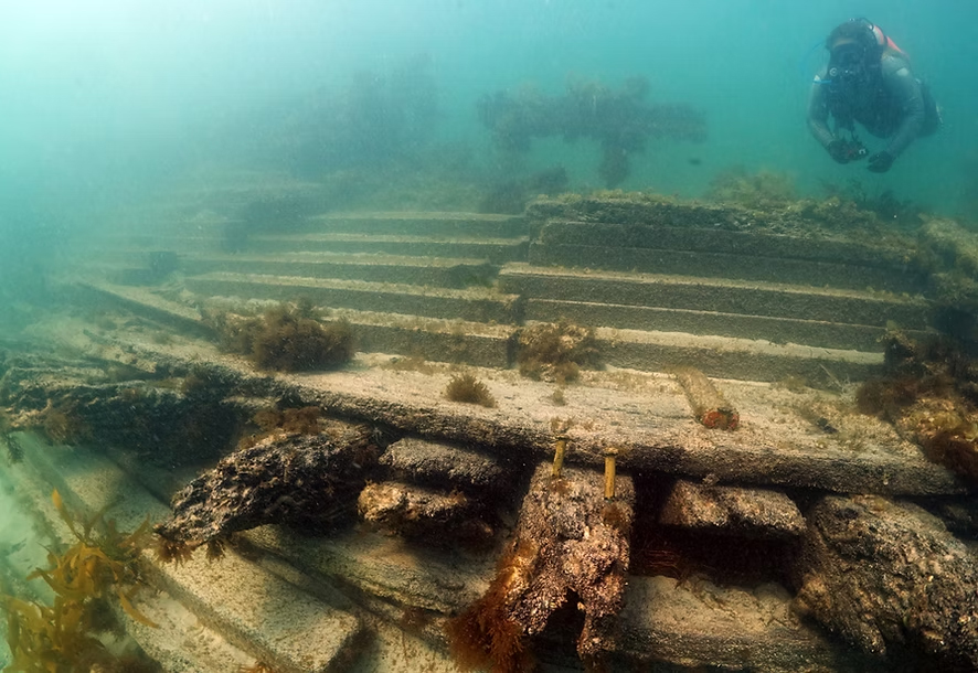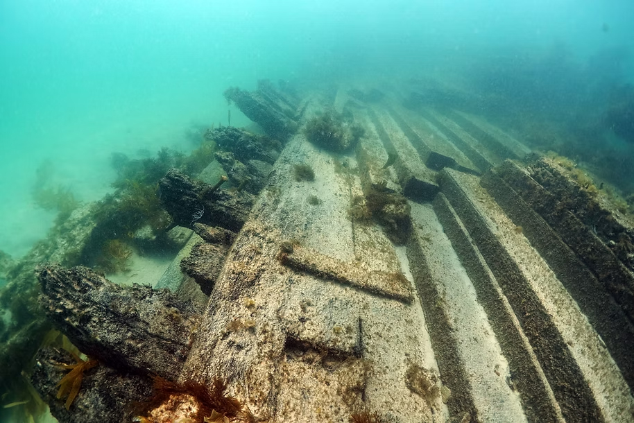 The wreck lies in 5–6 meters of water on a sandy bottom. The site measures roughly 35.5m by 8.5m. Divers can see the wooden hull frames (paired), sections of planking, and a jumble of deck beams. Notably, the cargo of neatly stacked timber sleepers is still visible in the center of the site, alongside copper nails and hull sheathing.