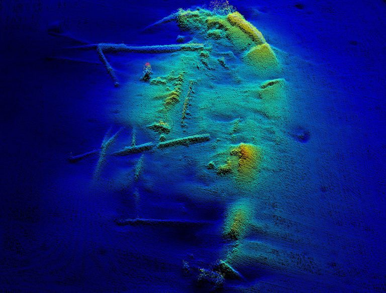 MBES 3D view of the wreck, with stern in the foreground. The deck beams protruding vertically from the seabed near the centre of the wreck, demonstrate the complete separation of the upper deck from the starboard hull plating, 2019.