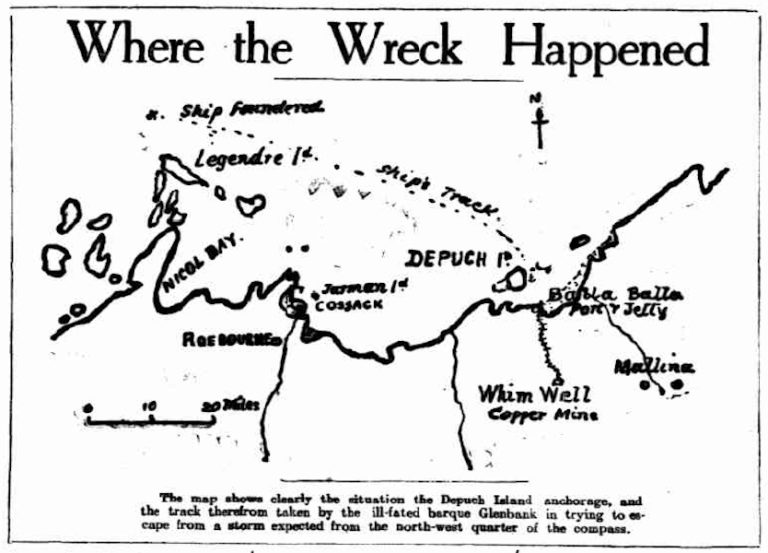 Map published in The Sunday Times showing the final journey of Glenbank, 1911.