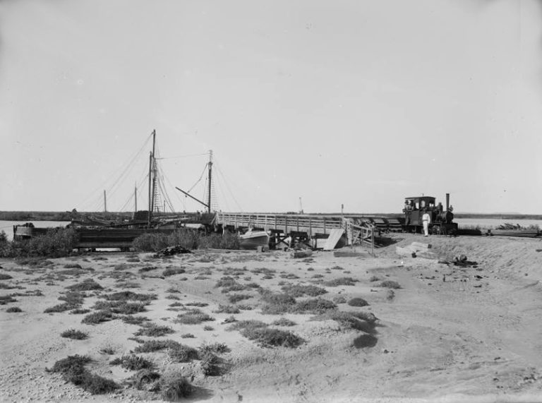 The Whim Well Copper mine was located about 20 kilometres inland from the coast. A private, single-track, narrow-gauge railway was used to transport the copper ore from the mine to Balla Balla jetty, which had been leased to the company. At the jetty, the ore was put on to lighters (a type of flat-bottomed barge) and ferried out to the anchorage near Depuch Island. There, the ore was loaded on to cargo ships, such as Glenbank. This would have been a manually laborious and time-consuming process; it could take months to load a ship.Train at Balla Balla jetty, 1912.E. L. Mitchell | State Library of Western Australia,