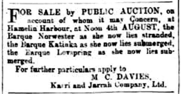 After being surveyed by Captain Webster, the Lloyd’s surveyor from Fremantle, the Nor’wester was sold at a public auction for £21 to Maurice Coleman Davies, the local timber merchant who was to supply the cargo. After several attempts the barque was refloated and towed by the tug Awhina to Fremantle. Davies’ intention was to repair the vessel to Lloyd’s A1 standard, and have it sailing again at an estimated cost of £400–£500. However in December he sold the barque to the Adelaide Steamship Company for use as a hulk, and it was towed to Adelaide by the steamer Rob Roy in early 1901.